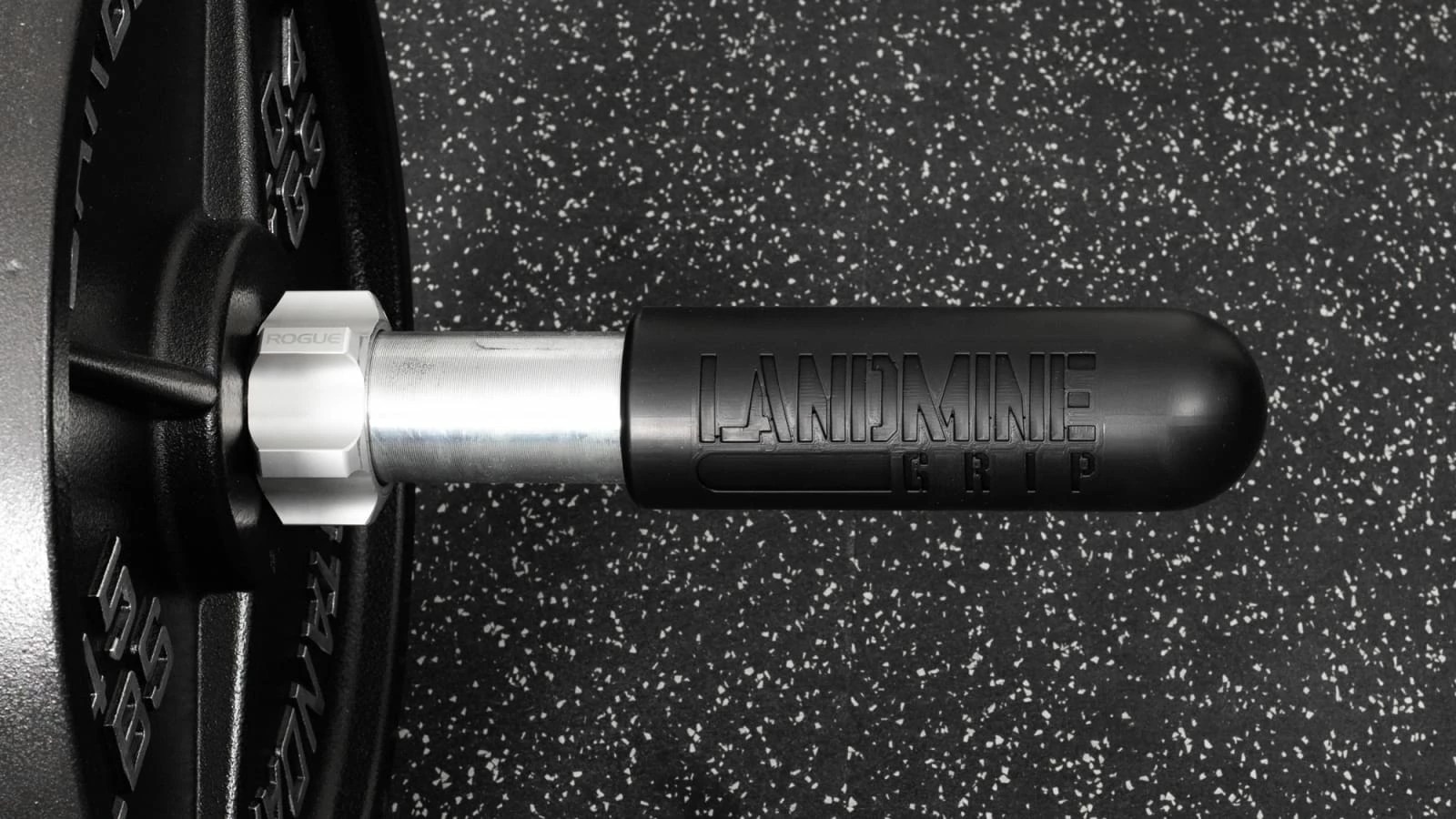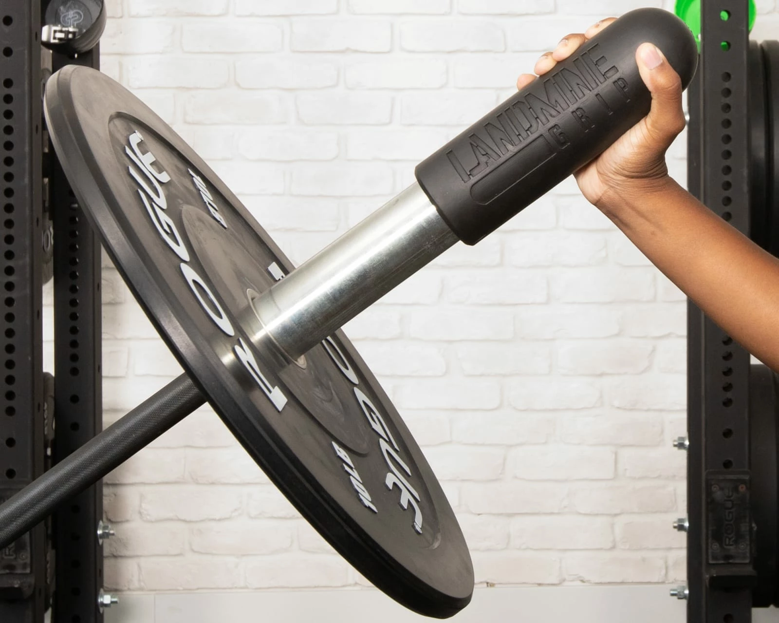 The patent-pending Landmine Grip from AbMat is designed to slide onto the end of any standard Olympic barbell, providing a firm, comfortable grip for landmine exercises and more.