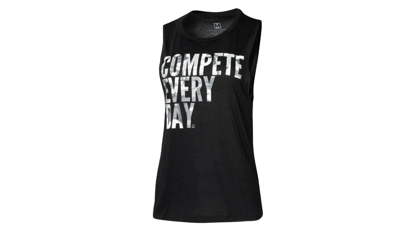 The Competitor Camo women’s muscle tank by Compete Every Day is made from a polyester-viscose blend fabric (available here in Black), with the company slogan across the chest. The flowy design offers a free range of motion in the gym plus ample comfort as casual wear.