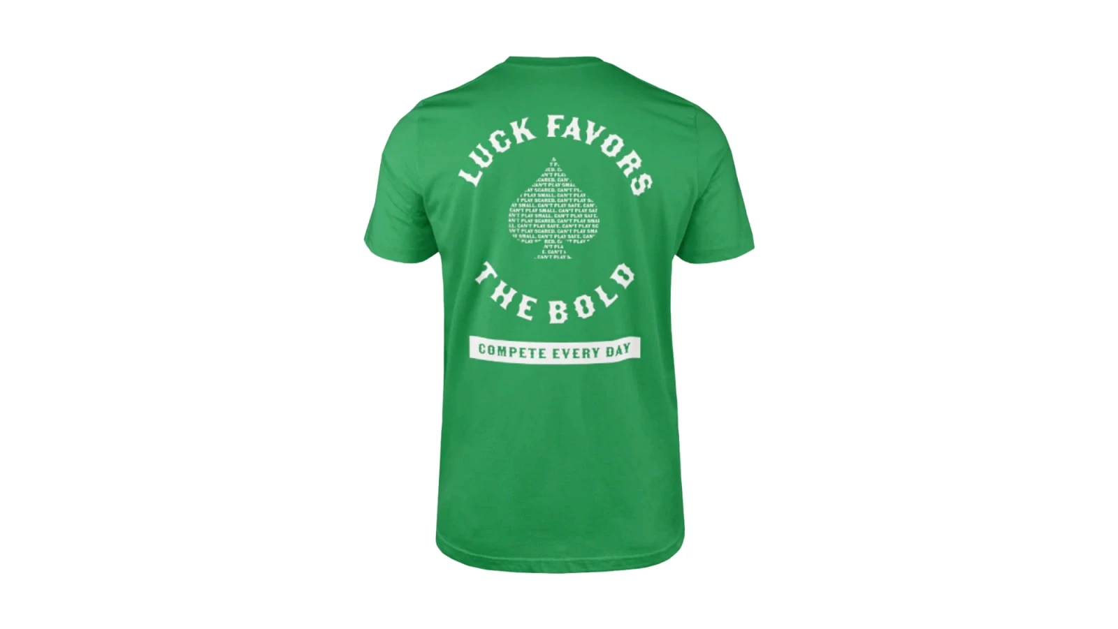 This men’s crewneck tee from Compete Every Day is available here in green and features the slogan “Luck Favors the Bold” across the back, with a C.E.D. spade logo on the chest. Made from a flexible, pre-shrunk cotton-poly blend material, this design offers a free range of motion in the gym and optimal comfort as casual wear.