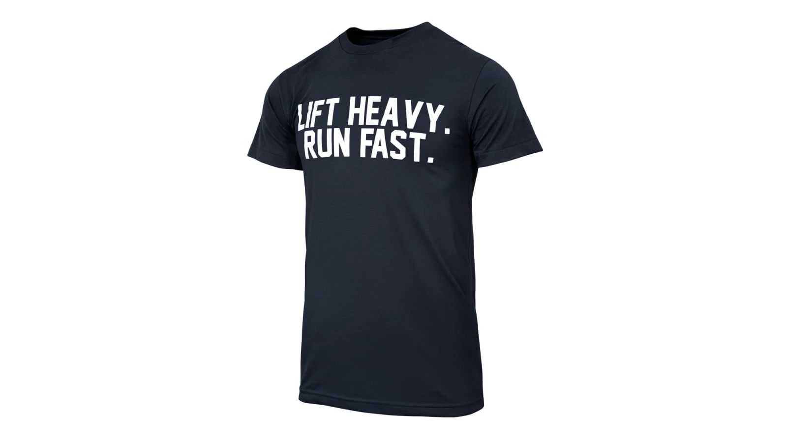 This quality American-made crewneck tee features the straight-forward slogan of CrossFit Linchpin across the chest: “Lift Heavy. Run Fast.”