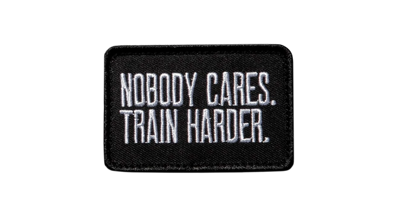 This 3×2” motivational patch features the official mantra of CrossFit Linchpin slogan “Nobody Cares. Train Harder.” with white stitching on a black background.