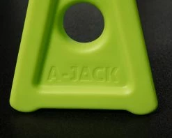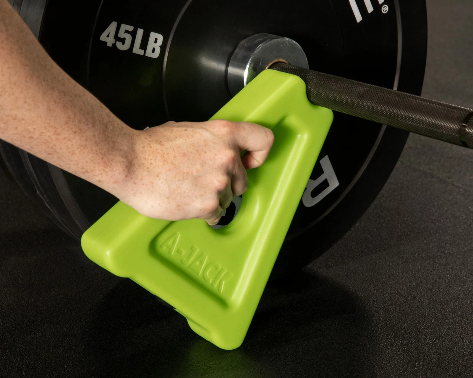 The A-JACK measures 9-⅛” tall with a 7” wide x 2” thick base, creating a strong, triangular A-frame foundation. Grooved edges and a round center opening enable a firm grip during set-up, as the user can simply position the angled top portion of the A-JACK under the bar (at the interior edge of the sleeve) and gently roll the bar into a stable elevated position for easy plate loading or unloading. When done, simply roll the bar back off the jack.