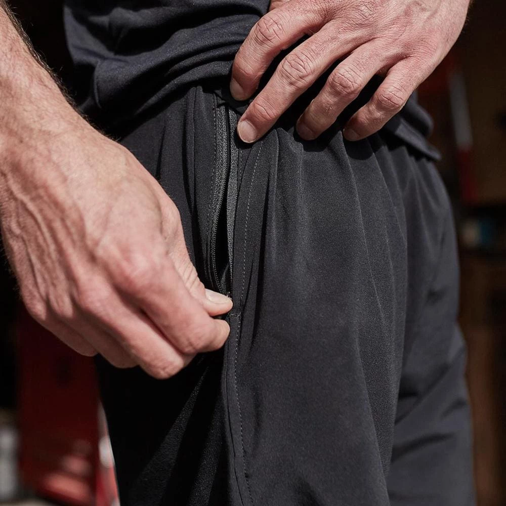 GORUCK’s Indestructible Training Shorts are made from a four-way stretch fabric (polyester-spandex blend) that’s light and breathable but also durable and sweat-wicking. Designed for the demands of high intensity workouts, these dynamic men’s athletic shorts also offer everyday comfort with drawcord adjustments and a performance brief liner, plus convenient storage with two front side pockets and a hidden zippered pocket (inside the right pocket).
