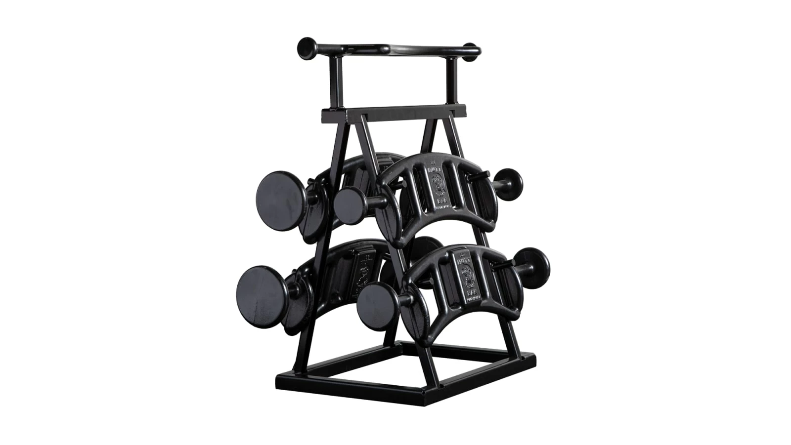The Mutt Bar is exactly what its name would suggest—a new mixed breed of exercise bar, bringing together elements of the traditional Olympic barbell, curl bar, Swiss bar, dumbbells, and more; all in a single cast iron unit. Mutts are produced in five unique weight increments (22LB, 33LB, 44LB, 55LB, 66LB) and can be ordered individually or as part of a full five-bar set with a custom bolt-together Mutt storage rack.