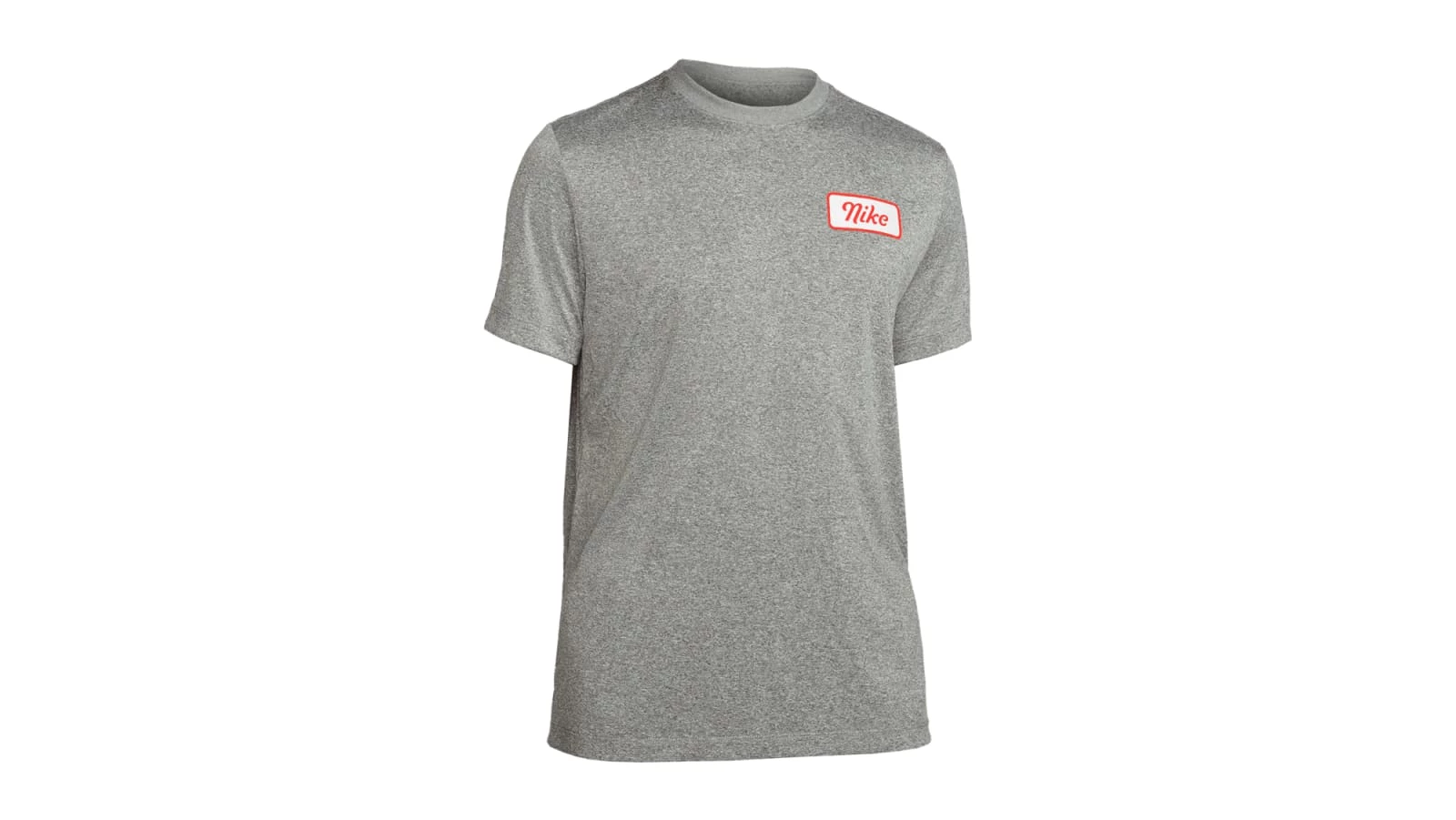 The Body Shop men’s fitness t-shirt is made from a durable 100% polyester fabric with Nike’s patented Dri-Fit technology to wick away sweat. Inspired by classic mechanic’s shirts, the front features a Nike “name tag” logo on the chest, while the back includes a “Nike Body Shop” design with a gear graphic and services list: “brakes, cooling, tune-ups.”