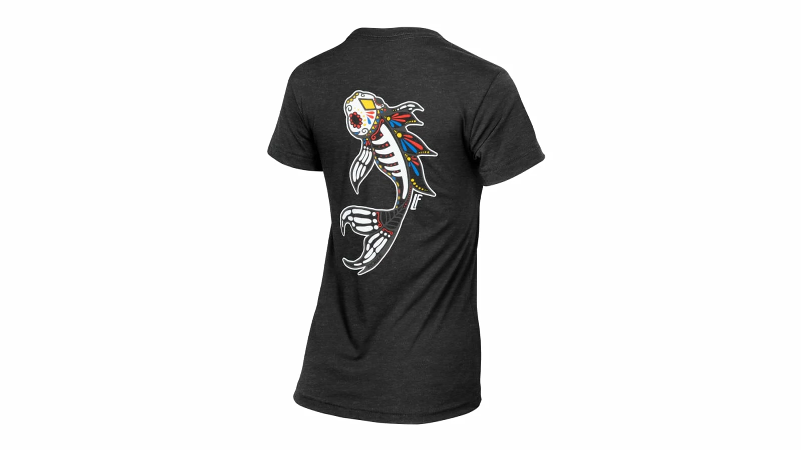 Inspired by 7x CrossFit Games competitor and perennial fan favorite Lauren Fisher, this tri-blend women’s tee is available here in grey with the Rogue logo on the chest in white. The back of the t-shirt features an exclusive fighting-fish skeleton design in red, blue, yellow, and white.