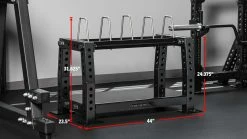 The Monster Bumper Rack is a compact, customizable equipment storage unit, made in the USA from the same 3×3” 11-gauge steel as our Monster Power Racks and Rigs. The patent-pending, 180 LB design includes an adjustable top rail and dividers for plates, with a flat, reinforced bottom shelf (40.5” wide x 20” deep) for other assorted gear.*