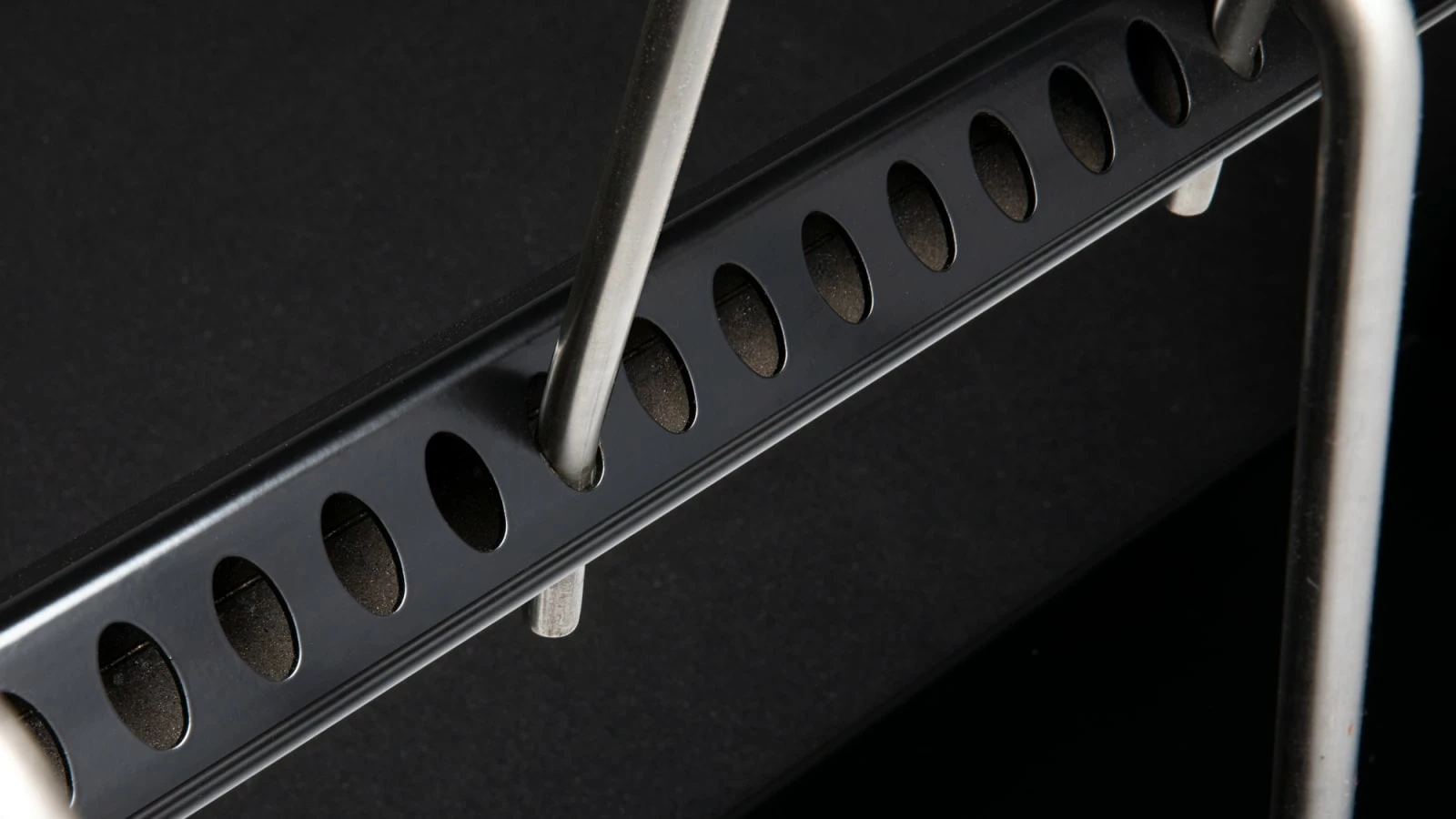 Creating a total footprint of 44” x 23.5”, the Monster Bumper Rack also gives gym owners the ability to store and organize any size/type of plate as they please, simply by repositioning the (5) stainless steel dividers along the 1” spaced holes in the railway tubing. Each unit comes with all required 1” hardware for set-up, along with laser-cut Rogue branding, an MG Black powdercoat finish, and a set of foot plates with ½” diameter holes (should you wish to mount the rack to the floor).