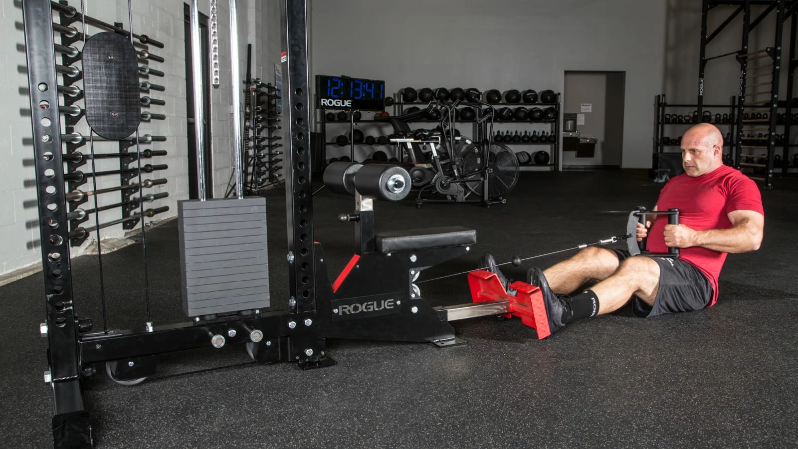 This is the fully updated, freestanding version of Rogue’s Monster Lat Pulldown and Low Row machine (a rack-mounted version is also available). Occupying just a 40″ x 60″ footprint, the 8′ tall unit ships fully assembled, and includes a 300LB weight stack (10LB increments), stainless steel lat bar, diamond-tread adjustable footplate, 6″ nylon pulleys, and a set of custom-built black carabiners—one each for the lat pulldown and the low row.