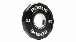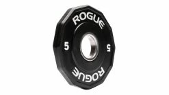 Rogue’s new patented 12-Sided Urethane Grip Plates feature a solid cast-iron core, impact-resistant polyurethane coating, and a unique dodecagon shape with angled edges to help prevent rollaway when a barbell’s on the floor. A re-engineered ledge grip design (on the 25 LB and above) also introduces tapered, recessed handle cut-outs on both sides. This allows athletes to quickly grab and pick-up from the center of the plate—no matter which side is facing out— rather than having to reach their fingers under the plate’s edges when it’s flat on the ground.