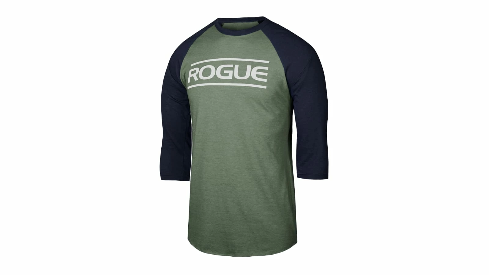 The Rogue 3/4 Sleeve Shirt is a flexible, breathable take on the classic two-color crewneck baseball tee, available here in Lieutenant Green / Navy. The Rogue logo is printed across the chest.