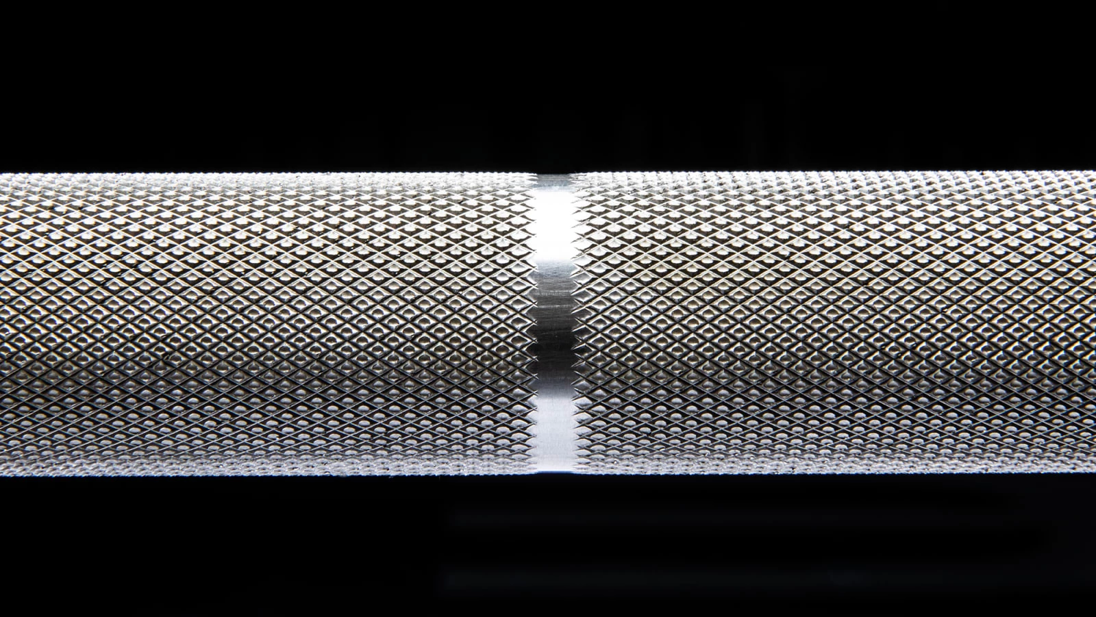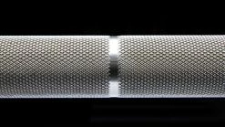 At a length of 94.49”, the Squat Bar is considerably longer than a standard Oly bar (our Ohio Bar is 86.75”), with 56” between the sleeves and a loadable sleeve length of 16.795” (vs. 16.4” on the Ohio Bar). The 32mm diameter stainless steel shaft has a tensile strength of 200,000 PSI, and the knurling runs across its entire length, with clearcut powerlifting marks and a center mark included. The aggressive knurl pattern ensures a firm grip without being sharp or abrasive.