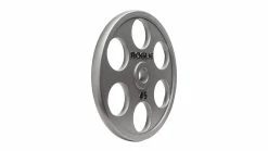 Our Rogue 6-Shooter Grip Plates feature a unique gray hammertone finish, black text, and six symmetrical grip holes spaced out around the circumference of each 25LB, 35LB, and 45LB plate (a Urethane Coated 6-Shooter is also available). The holes are precision-cut and in close proximity to the raised lip at the edge of each plate, offering athletes a comfortable grip and an easier way to lift, carry, or load a plate from any angle.