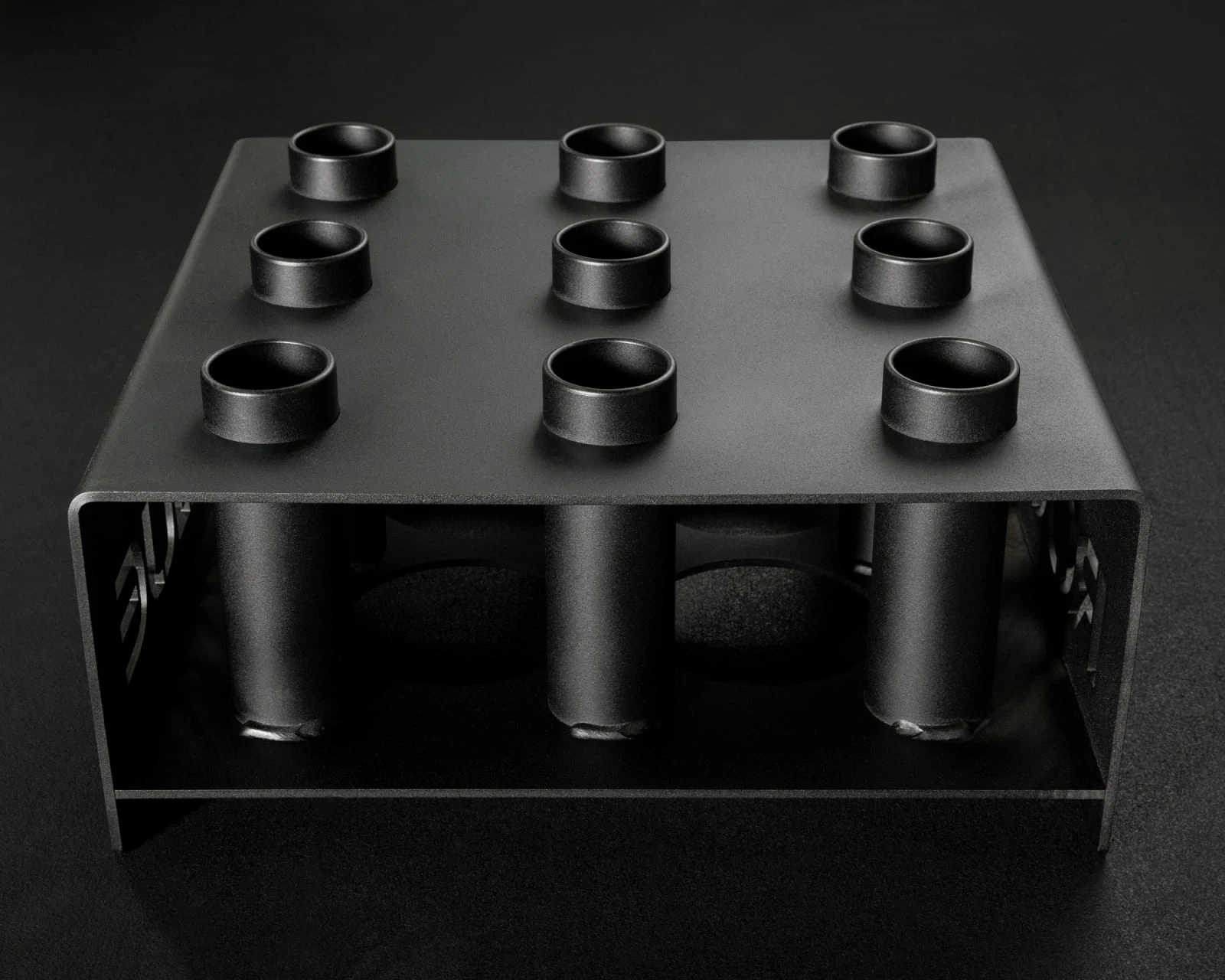 With a footprint of just 18”x18”, the 9 Bar Holder can instantly organize and improve the efficiency of any training space, be it a garage gym or large strength and conditioning facility. The vertical, sleeve-first storage design keeps your bars’ knurling out of harm’s way.