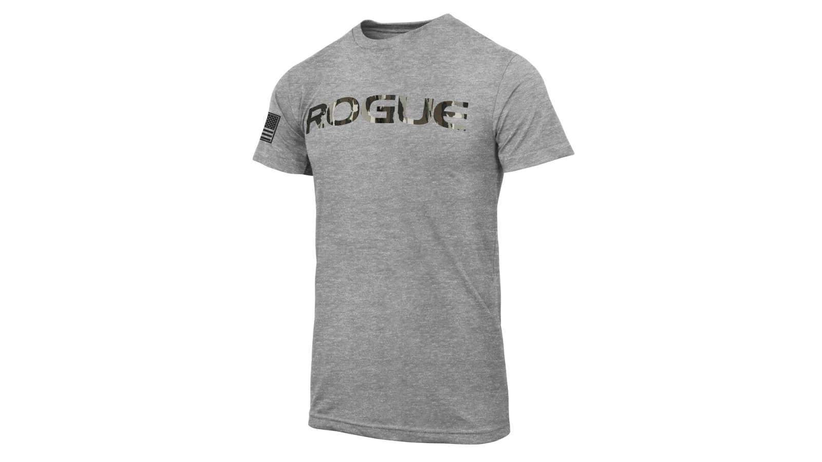 The timeless classic that never goes out of style. Each Rogue Basic Shirt is manufactured in the USA and features a lightweight 50% Polyester / 25% Ring-Spun Cotton / 25% Rayon construction with a slim / athletic fit. The Rogue logo is printed across the chest in a camo print and the military-style American flag emblem is included on the right sleeve.