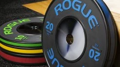 Rogue Black Training KG Bumper Plates are available to order in pairs or as full sets up to 140KG. They’re an IWF standard 450MM in diameter, with chrome-plated steel disc inserts and a 50.40MM collar opening for a firm, stable hold. Raised rubber flanges are included to help prevent friction and scuffing, and lipped edges make the bumpers easier to pick up off the floor or off a rack.