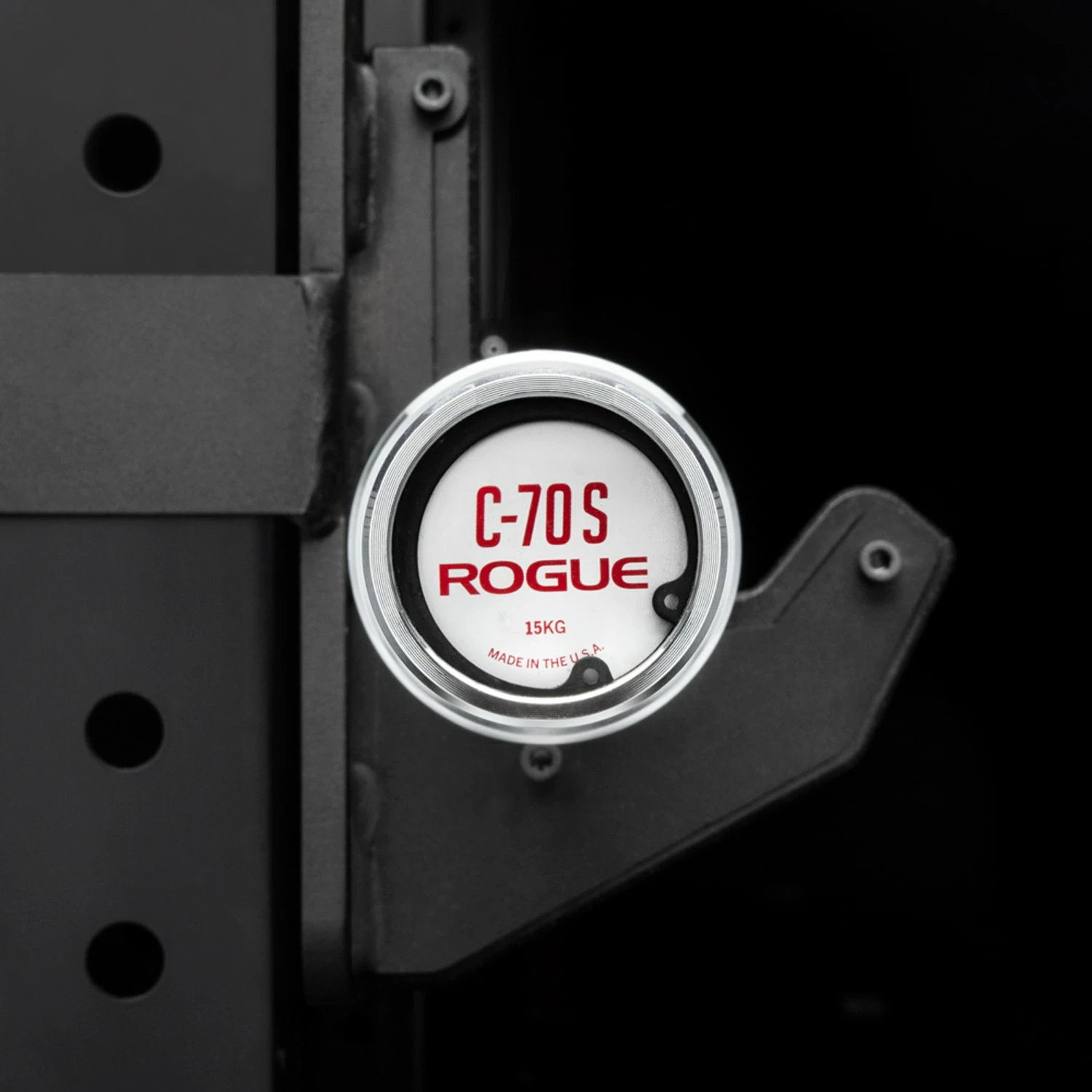 The 15KG Rogue C-70S Barbell is essentially a “shorty” version of our 20KG Ohio Bar and a rackable version of our original C-70 short bar. Available here with a Cerakote shaft finish and chrome sleeves, this compact 72” design can benefit anyone training in tight quarters, be it a small garage gym or busy training facility, with nearly 15” of space-saving efficiency versus a full-length bar.