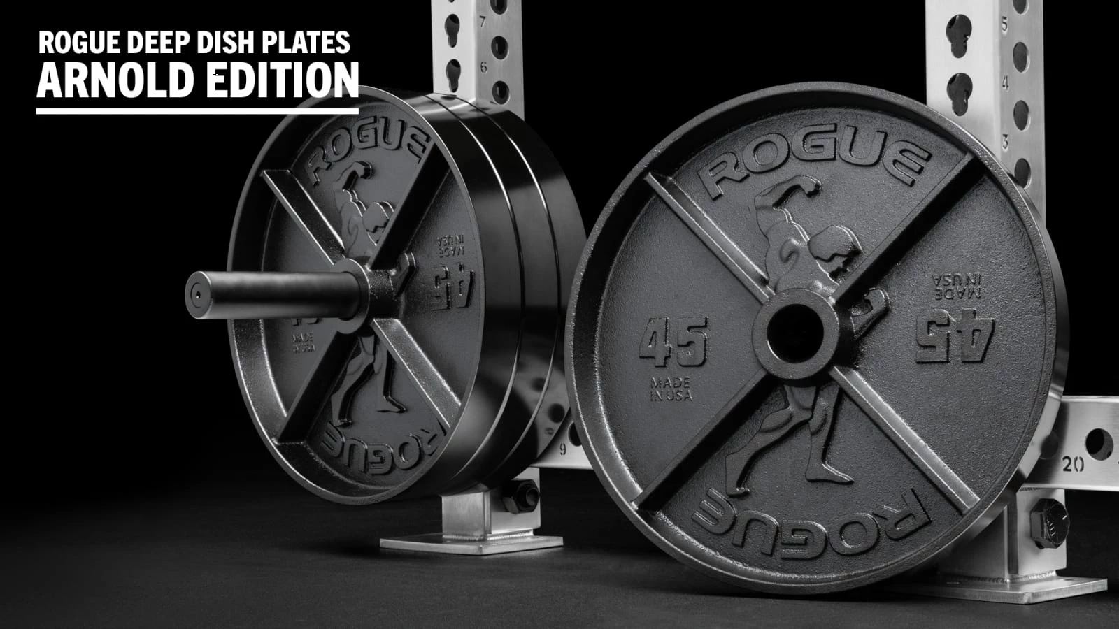 Distinguished by the iconic Schwarzenegger silhouette embossed between the weight indications, each Rogue Arnold Deep Dish Plate also includes a machined outer rim, back face, and center hub in the vintage style, with a 450mm outside diameter, 50mm width, and a strict weight tolerance of +2% / -0%. They are available to order as singles or in packs, and are produced exclusively in the 45LB weight increment.