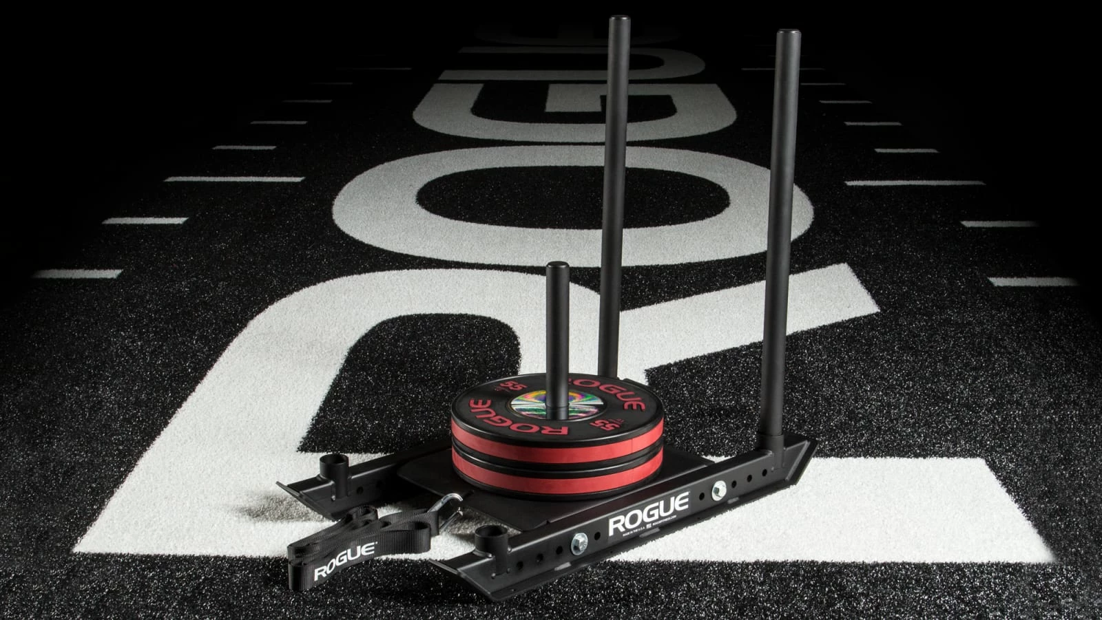 The CrossFit Games battled-tested Rogue Dog Sled comes standard with a quarter-inch steel base plate, 2×3” 11-gauge steel tubing, and a pair of 3-foot upright push bars designed to accommodate both high and low push stances. Compared to many prowler and speed sled designs, the portable Dog Sled has a smaller overall surface area, allowing you to get the most out of the plates that you own.