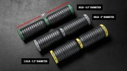 Compared to other massaging rollers, the substantial weight of the DT Tempering Rollers can create a much more intense form of soft tissue mobilization, without causing any additional pain or discomfort in the process. All of our rollers are made from powder-coated cast iron, and feature recessed ends that act as the handles, enabling easier handling and control. Color-coded bands are included in the center of each roller (indicating the weight) and at both ends (featuring Rogue branding) for easy identification from a distance: Green = 50 LB, Gray = 80 LB, and Yellow = 110 LB.