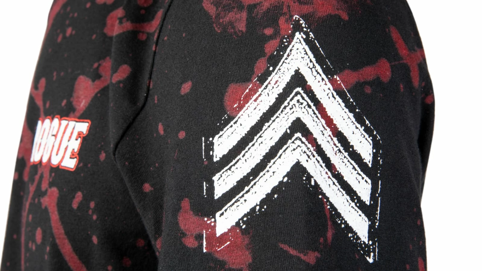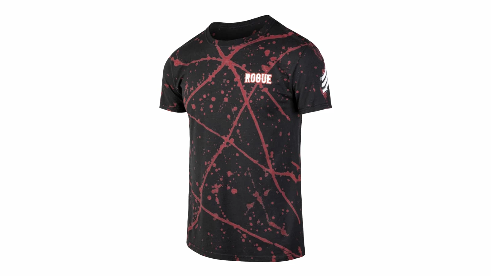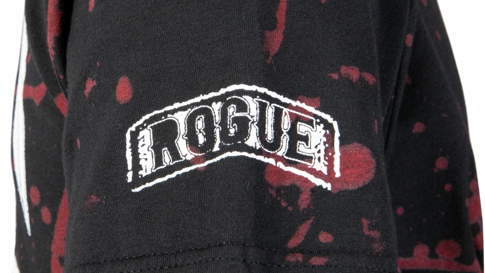 The official Rogue Halloween tee for 2021 is available here in Black with red “splatting” effects and a re-imagined Grim Reaper version of the Rogue Fitness International logo on the back. Stylized Rogue branding is featured on the chest and right sleeve, with military chevrons included on the left.
