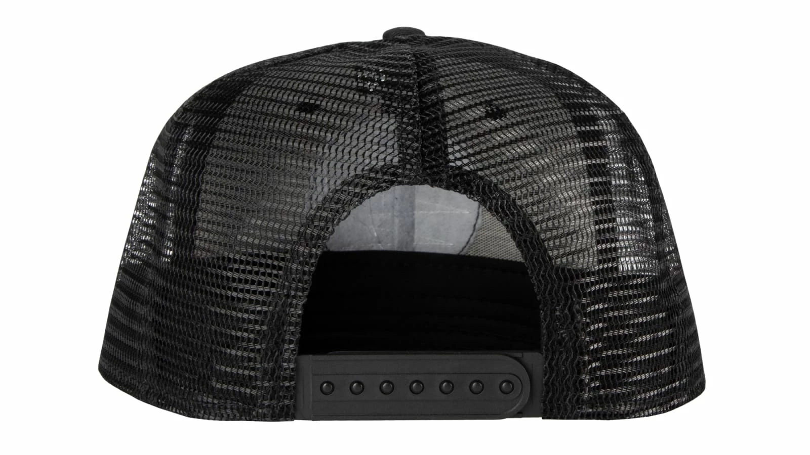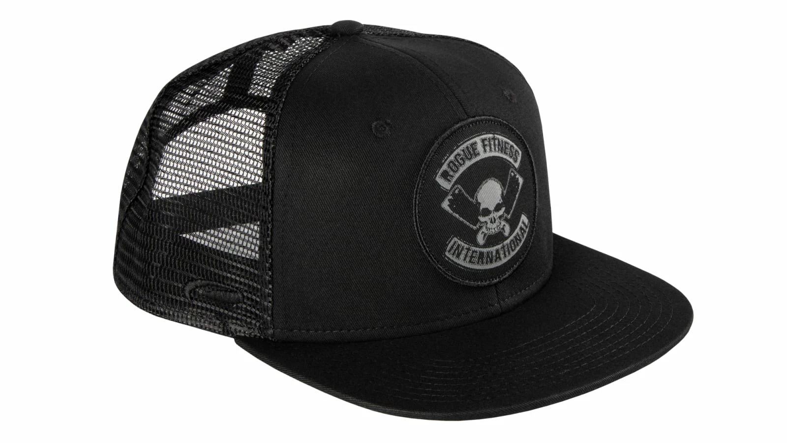 A modern tweak of the timeless trucker hat, this flat-billed, snapback ball cap is all black with the official Rogue Fitness International skull patch attached to the front in black and grey.