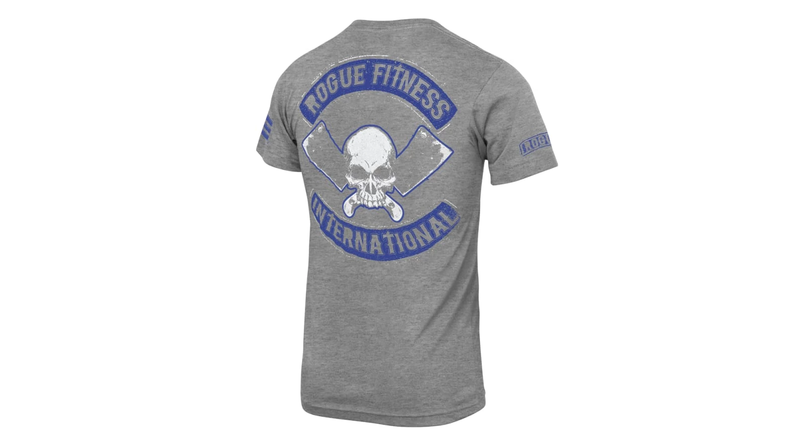 The Rogue Fitness International logo has been one of our most popular designs since 2010—seen on the backs of top competitive CrossFit athletes and weekend warriors alike. This men’s / unisex edition of the International tee includes the iconic skull + butcher knives image on the back and the Rogue logo on the front, printed on a soft cotton-poly blend material with additional art on both sleeves.