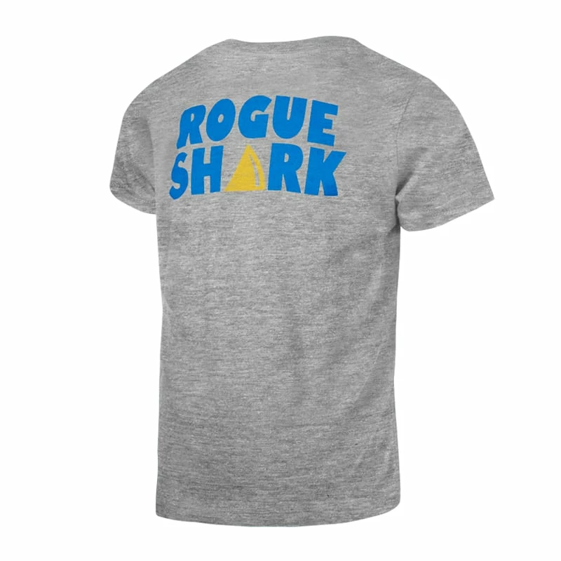 Beware the fin above the water. Our “Rogue Shark” shirt is designed for the kid athletes who will grow up to be next great Rogue athletes. These comfortable poly-cotton-rayon blend shirts are available here in grey with a cartoon blue shark on the front and the words “Rogue Shark” in bright blue and gold on the back. Six sizes to choose from.