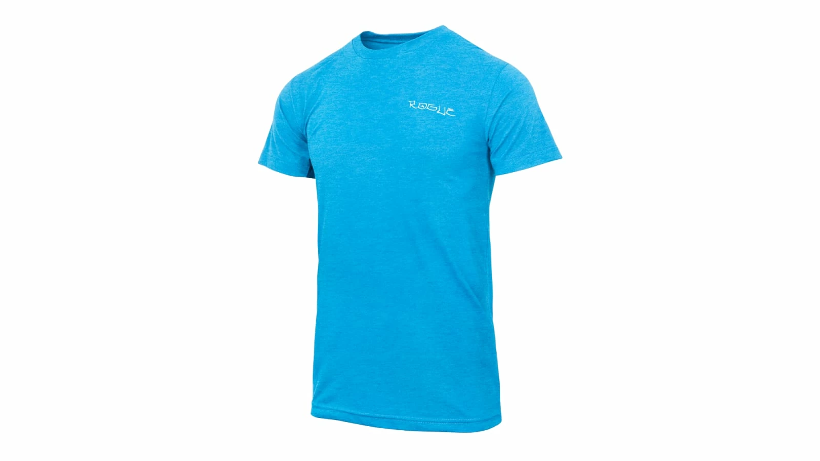 The Rogue Los Muertos Shirt is inspired by the classic calavera, or sugar skull, associated with the Day of the Dead (Día de los Muertos). It’s available here in a new Neon Blue design with a stylized Rogue logo on the front and an original smiling skull graphic on the back in yellow, white and purple.