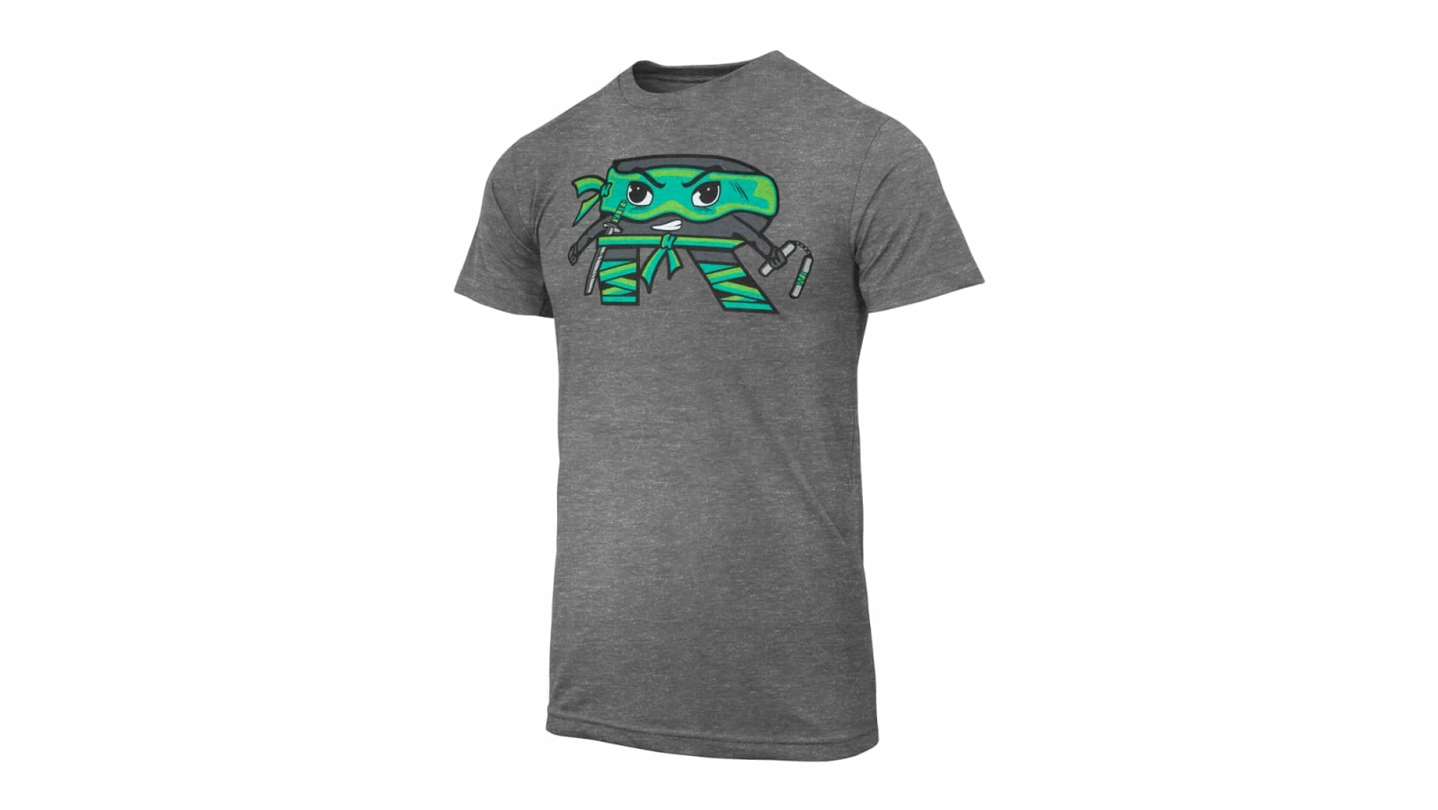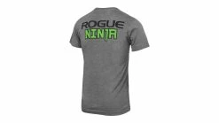 The Rogue Ninja Shirt is a gray, tri-blend tee featuring a cartoon ninja version of the Rogue “R” logo on the front in black and green.