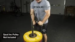 The Rogue Tricep Push Down Attachment adds a new, challenging grip element to your upper body training regimen. Compatible with the Spud Inc. Econo Tricep & Lat Pulley, this dual-handle, V-shaped attachment is made from knurled 1″ schedule 40 pipe, with 3″ diameter steel spheres welded to the end of each handle.
