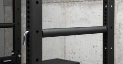 The unit comes standard with Infinity J-cups, a 24” removable pin/pipe safety set, and side panels with laser-cut Rogue branding. There is 1″ on-center hole spacing up the front and back of the uprights to allow for maximum height adjustability, meaning the standard 17.5″ bench height can be moved up and down by 1″ increments to serve a wide variety of athletes. Customers also have the option of adding elevated spotter decks that bolt onto the bench, giving spotters extra leverage and traction in case of a missed lift.