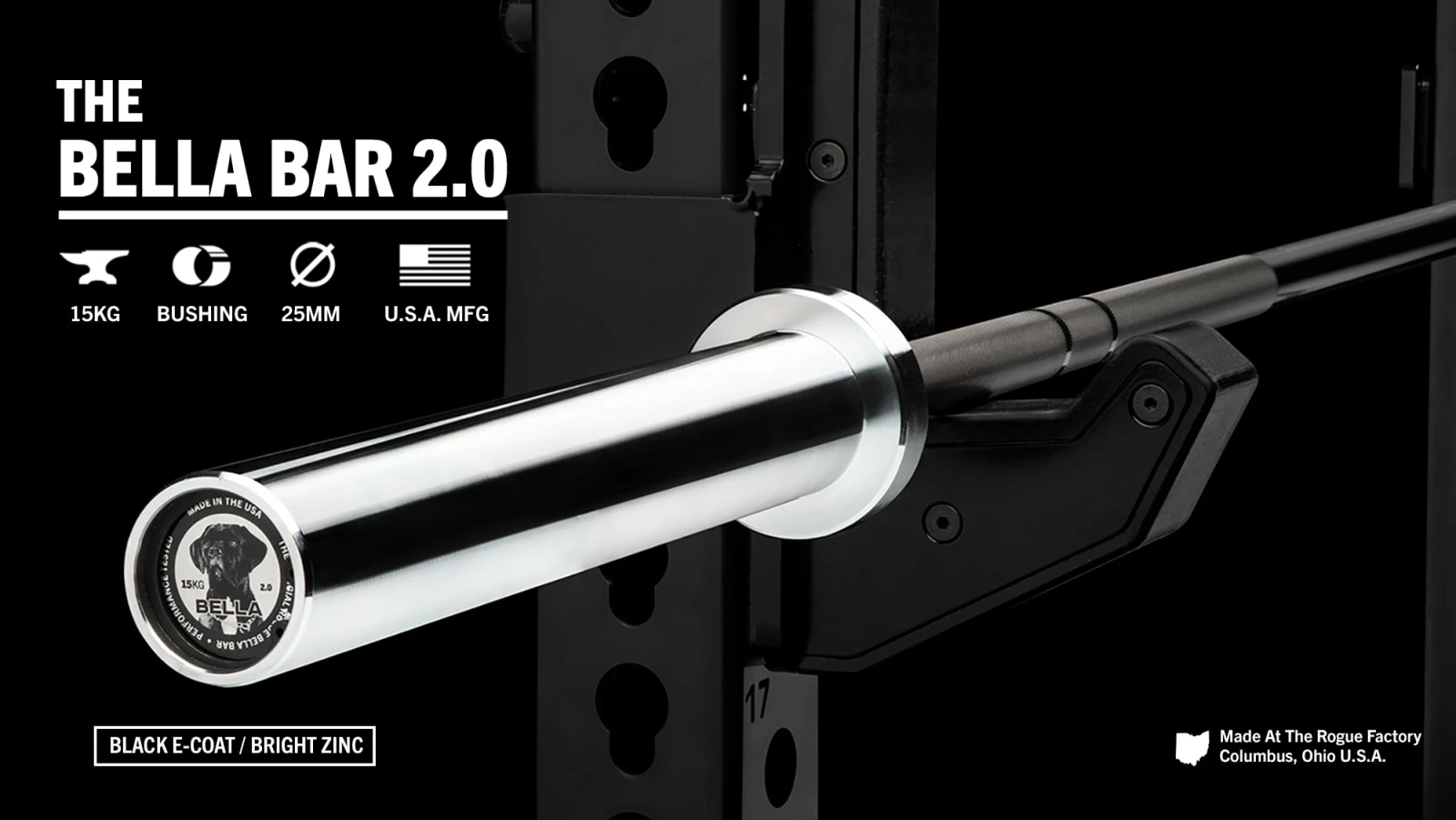 Like all Rogue Bella Bars, the E-Coat model is fully machined and assembled in Columbus, Ohio. It includes a 190,000 PSi tensile strength steel shaft, dual knurl marks (no center knurl), and bright zinc sleeves. The hybrid knurling pattern offers a firm but comfortable grip on both Powerlifts and Oly lifts, and quality bronze bushings help create the perfect balance of rigidity + natural whip.