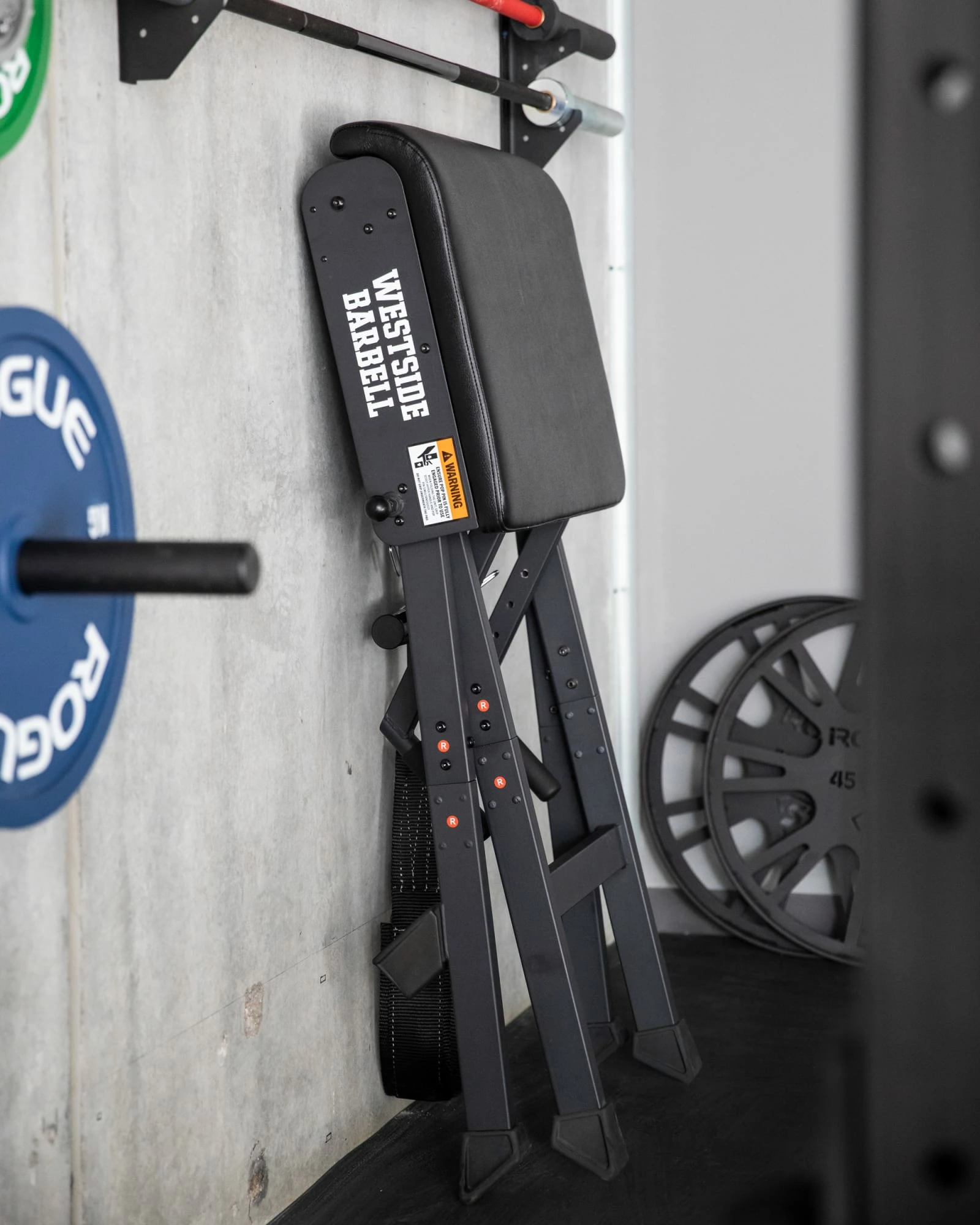 The Scout Hyper is a patented, foldable reverse-hyper machine developed by powerlifting legend Louie Simmons and Westside Barbell. This uniquely lightweight and mobile design features hinging legs that lock into place with pop pins and easily fold back for efficient storage after use (the total depth of the unit, when folded, is just 13”).